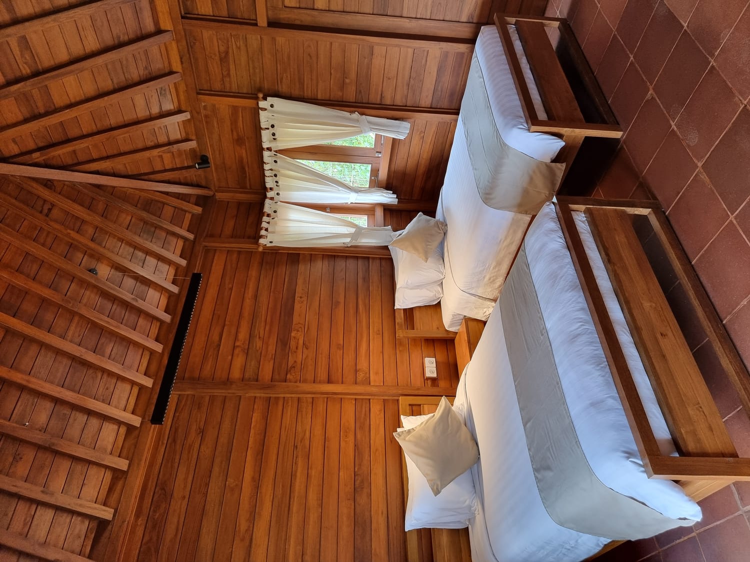 The Grand Deluxe bedroom comes with a pillow-top super king-sized bed framed by a magnificent royal headboard and hand-carved wood finishing. Along the walls and on the ceiling are fragrant wood panelling, a beautiful contrast against the floor’s cool grey stones.